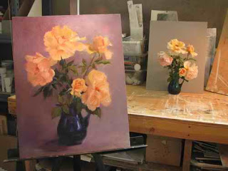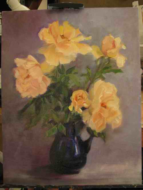 I did the rough-out of a painting I’ve been promising my niece for about a decade but felt I needed a warm up before I could dive into it. A couple of days ago Dennis shooed one of our resident triplet fawns away from my favorite rose bush so I decided to cut some for us to enjoy before they disappeared. They were on our breakfast nook table in a blue glass vase and since all I wanted to do was stare at them and breathe their sweetness I decided to paint them. This was bold decision. Flowers, especially roses, are hard to paint (for me anyway) and they only behave for a day at most before they droop and fade and you can’t figure out why that shape you thought you’d nailed doesn’t seem to be there anymore. BUT they were SO pretty…and so I began. Here’s how it went: