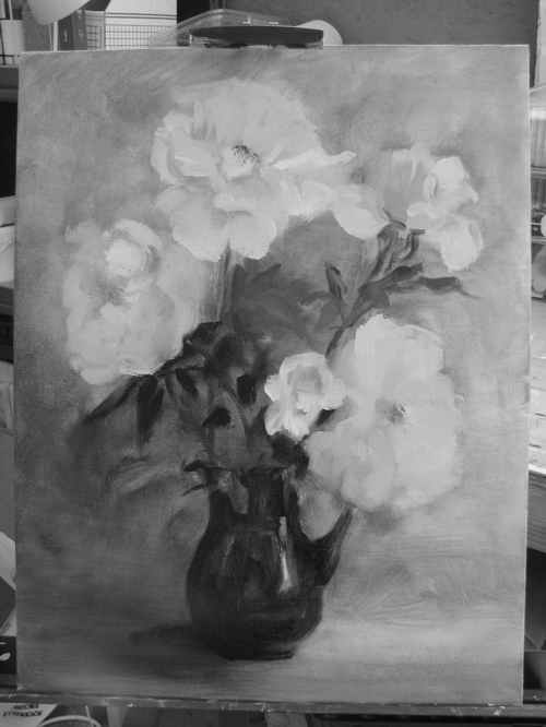Got to stop. I’m SO tired. I can see that the flowers don’t have enough change in value to give them any volume but I have no more energy and the light is totally different. I set the vase outside hoping at least the bud, which is my focal point, will still be recognizable in the morning.