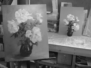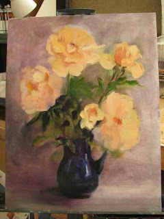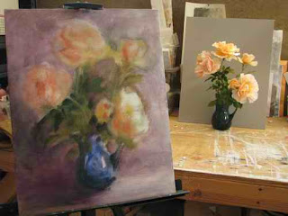 I did the rough-out of a painting I’ve been promising my niece for about a decade but felt I needed a warm up before I could dive into it. A couple of days ago Dennis shooed one of our resident triplet fawns away from my favorite rose bush so I decided to cut some for us to enjoy before they disappeared. They were on our breakfast nook table in a blue glass vase and since all I wanted to do was stare at them and breathe their sweetness I decided to paint them. This was bold decision. Flowers, especially roses, are hard to paint (for me anyway) and they only behave for a day at most before they droop and fade and you can’t figure out why that shape you thought you’d nailed doesn’t seem to be there anymore. BUT they were SO pretty…and so I began. Here’s how it went: