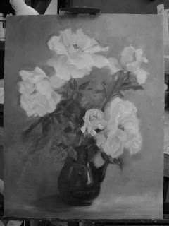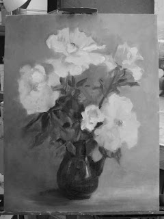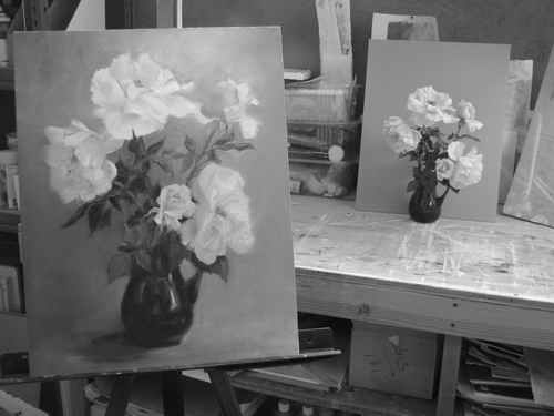 Got to stop. I’m SO tired. I can see that the flowers don’t have enough change in value to give them any volume but I have no more energy and the light is totally different. I set the vase outside hoping at least the bud, which is my focal point, will still be recognizable in the morning.