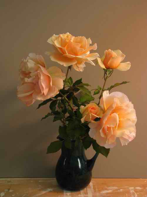 I did the rough-out of a painting I’ve been promising my niece for about a decade but felt I needed a warm up before I could dive into it. A couple of days ago Dennis shooed one of our resident triplet fawns away from my favorite rose bush so I decided to cut some for us to enjoy before they disappeared. They were on our breakfast nook table in a blue glass vase and since all I wanted to do was stare at them and breathe their sweetness I decided to paint them. This was bold decision. Flowers, especially roses, are hard to paint (for me anyway) and they only behave for a day at most before they droop and fade and you can’t figure out why that shape you thought you’d nailed doesn’t seem to be there anymore. BUT they were SO pretty…and so I began. Here’s how it went: