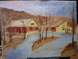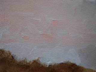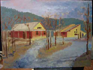 The glass is an old bathroom shelf which is nice because it’s sturdy and has rounded edges. I backed it with kraft paper which is a good neutral background that allows me to see the colors I’m mixing without the distraction of old paint stains on the pallet. Because this is a new arrangement for me I wrote the color positions and made a spot of each color on the paper, then I just taped the paper to the glass around the edges. This limited color set up was suggested in a painting video and I thought I would try it. Clock-wise: Aliz Crimson, Cad Red Light, Cad Red Deep, Cad Orange, Cad Yellow Deep, Cad Yellow Light,(Rembrandt brand recommended for all the Cads. Do you agree?) Titanium White, Veridian, Cer. Blue, Ultramarine, Brnt Umber, Ivory Black at the bottom. The blob in the middle is Gamblin Gel Medium with some Gamblin Liquid Alkyd mixed in to help things dry a little faster.