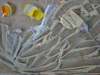 Every time I stop painting I scape up all the mixed colors and keep the blend in a pile on the pallet. It’s a mix of all the colors I am using and so makes a great neutral that will naturally harmonize with the current color scheme.
