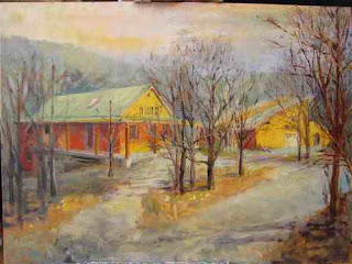 This is the point in almost every painting where I could just turn it to the wall and walk away. The initial buzz is over and I start to struggle. Something is not right with the buildings in this one but I can’t figure out what. Terry Miura, who taught a painting workshop here a couple of years ago said, in effect, ” Figure out what’s wrong and then fix it, don’t just muck around hoping it will get better.” So I work on the hills and sky a bit more and leave the buildings until the answer comes.